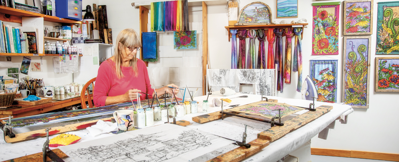 Walking into Smooth as Silk, Marilyn Cook’s silk-painting studio in Sackville, N.B., is like walking into a magical fabric garden. Paintings of fishing villages, flowering plants, ferns, and birds festoon the walls. There are rainbow-hued, hand-painted silk scarves hanging on racks and pegs, and a stack of floral-themed chair mats hooked with strips of leftover silk waiting for new homes. Cook is working on a new wall-hanging of sunflowers, with stacks of unpainted silk awaiting her skills.