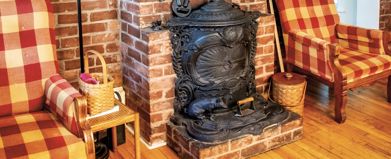 Bricks from the Clifton House Hotel, which burned in 1961, form a themed kitchen wall and frame a cast-iron wood stove from the Homestead in Tryon. Pinned on either side are working oil lamps from the Lefurgey House. Mounted on the bricks is a cast-iron mural featuring couples dancing, exhibiting rich history and craftsmanship. The kitchen’s wooden beams and oversized cabinets, salvaged from the hotel before it burned, add warmth.