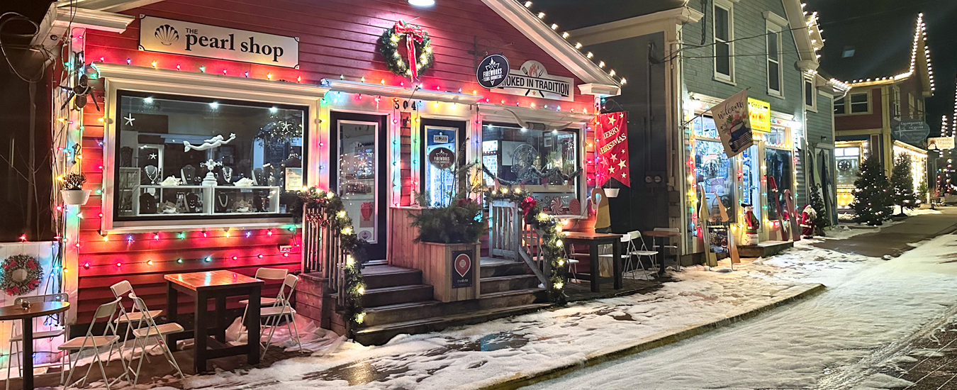 Using some tricks of the trade, like fabric snow and calling in the town fire department for a “wet down” (hosing down the street so it glistens as if with melted snow), procuring a truckload of fresh-cut Christmas trees and handmade wreaths from a local producer, and using a vault of holiday décor from a seasonal festival, Keefe had just about everything he needed to transform the trendy summer destination into a scene ready for Santa. Except the lights.