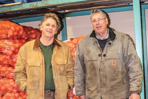 Mark and Peter Sawler in the onion storeroom. “I’m the farmer, Mark’s the packer,” Peter says. Their brother Roger also works on the farm.
