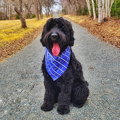 Tongue tied Gus is a three-year-old Australian Labradoodle who is always camera ready. He is an avid rock collector and always finds a new one on his walks that he takes home to add to his collection.