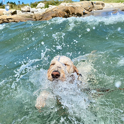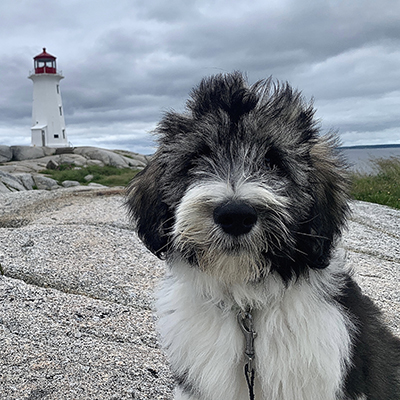 Land ho! Sam, an eight-year-old Golden Retriever is happiest on or in the water. When he is not navigating Nova Scotia’s Eastern Shore, he loves to relax with a liver treat in his oceanside cottage gazebo.
