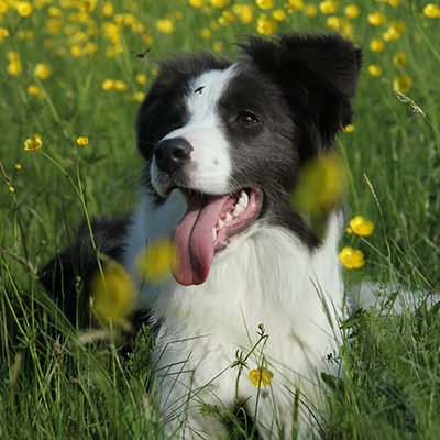 Stop and smell the flowers Macca is a three-year-old blue Border Collie who is usually on the move. He’s a sporty guy who loves to hike, swim, and paddleboard with his humans, and occasionally stops to smell the buttercups.