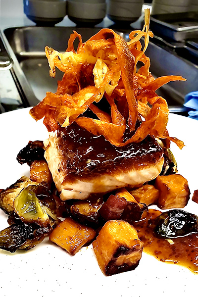 One of the most popular menu items this season is his Apricot Chili Glaze Salmon. To prepare this dish, put 4-5 slits in the skin of a portion of salmon and give it a generous coating of salt. Then place in a very hot pan with a little oil, searing the fish until it cooks halfway through. Flip, adding a knob of butter and baste the salmon for a minute or two.