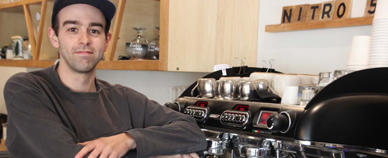 “They’re Italian, so they’re built like Ferraris,” says Harlan Thompson. “They’re made by Sanremo, the sports cars of the coffee world.” Thompson is the barista here at The Tipsy Muse Café in downtown Fredericton. He’s talking about the espresso machine and the coffee bean grinder he spends his days operating.