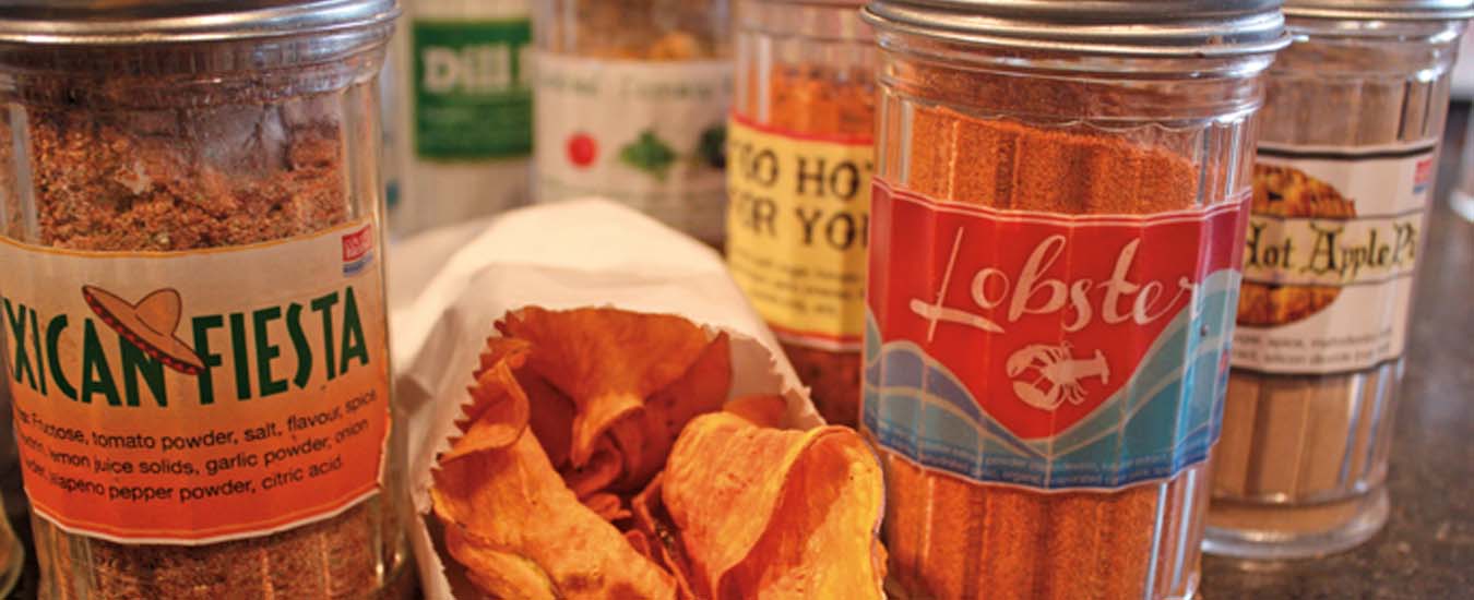 Mexican Fiesta, Dark Chocolate Explosion, Hot Apple Pie, Lobster—these are just a few of more than 30 choices, not for dishes at some eclectic buffet, but as flavourings for my two bags of potato chips fresh from the fryer. I just watched them come off the assembly line at the Albright family-owned Covered Bridge Potato Chips near Hartland, New Brunswick. One bag is filled with sweet potato chips. For them, I go all out with a few shakes of “Too Hot for You.” For the bag of regular chips, I have to try the lobster seasoning.