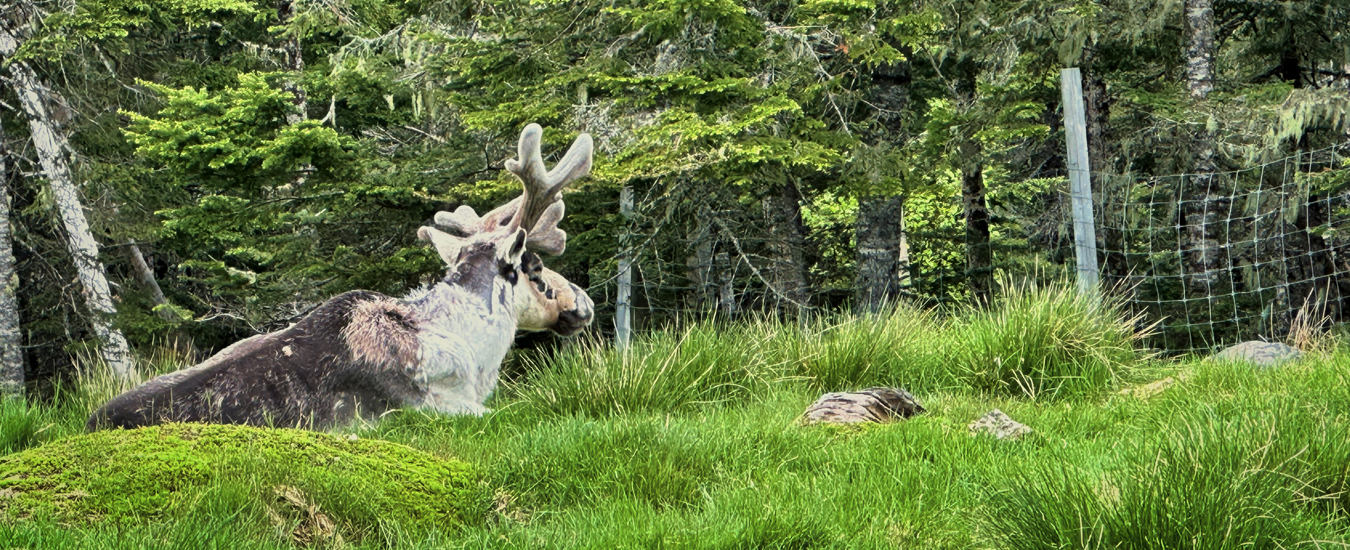 The largest animals are near the end of the trail. In enclosures so large I can’t see where the fencing ends, I spot a moose standing in the open. In the next, two woodland caribou lay in a grassy field, their antlers covered in soft velvet, slowly chewing their cud. It’s a privilege to be in their company, seeing them as relaxed as in the wild, and yet well cared for.