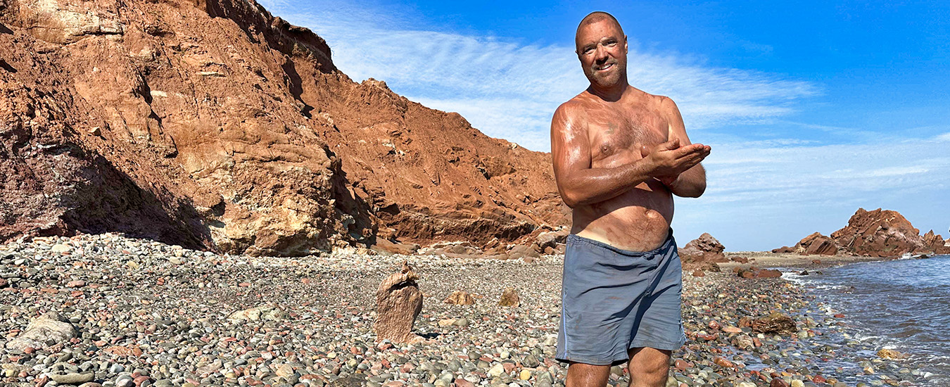 Claude Boudrias is my guide, instructor, and fellow mud wallower. He’s with Le Auberge de Salicorne, the inn on the northern tip of the Magdalene Islands where I’m staying, and the purveyor of this unique experience. I’ve brought my lifelong buddy, Roger, who could use the break from the stress of recent upheavals in his life. After a 10-minute kayak paddle across the Bassin aux Huitres lagoon (Oyster Basin) from Salicorne, Boudrias scratches into the sand a rough sketch of Earth as it looked over 300 million years ago.