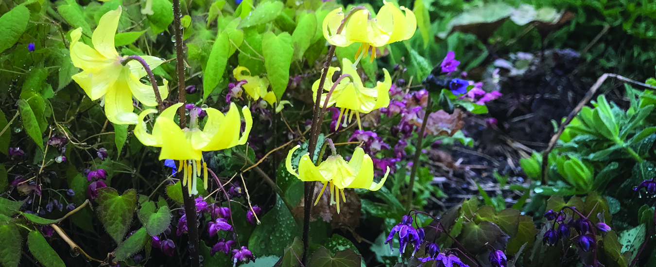 Header Caption: Dogtooth violets, also known as trout lily, in a garden setting.