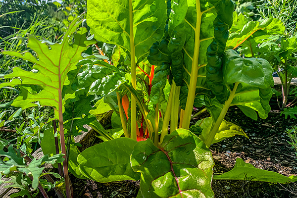 Swiss Chard. Another vegetable that will do well in a good-sized container, chard is delicious and easy to grow. If you’re like me and like your vegetables to be beautiful as well as tasty, try a couple of the rainbow-coloured varieties, like ‘Bright Lights’ and ‘Rainbow’ which produce brilliantly-coloured stems and tints of colour up into the leaves. Chard will go on for weeks and months if you keep picking the larger leaves and let the smaller ones grow on.