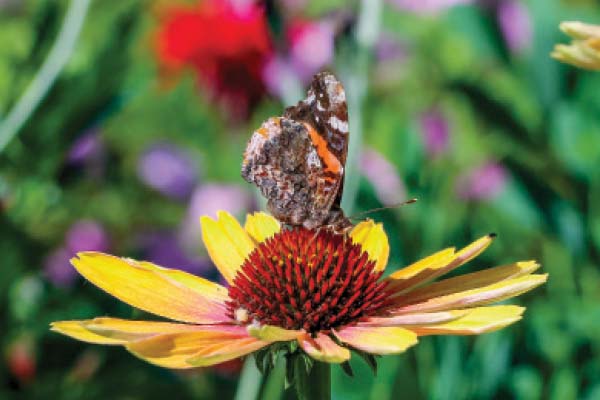 A fritillary butterfly lands on Echinacea ‘Evening Glow’ to search out its supper.