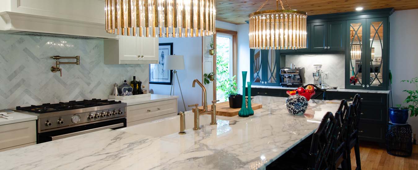 I designed a coffee bar area to house and complement all the equipment and to add a focal area to the space. The unit features mirrored doors, which bounce light around the space and draw the eye in, while the gorgeous vintage-inspired paint colour ties in the original wood ceilings. It’s here that the vision really started to take shape! We chose an authentic Calacatta marble slab from a local stone supplier and large herringbone tiles in Oriental white marble to complement and not compete with the slab. The idea behind this was to mix marbles as they do in Europe. We can now enjoy a macchiato—or my favourite, cappuccino—whenever we want, without stepping foot outside our home.