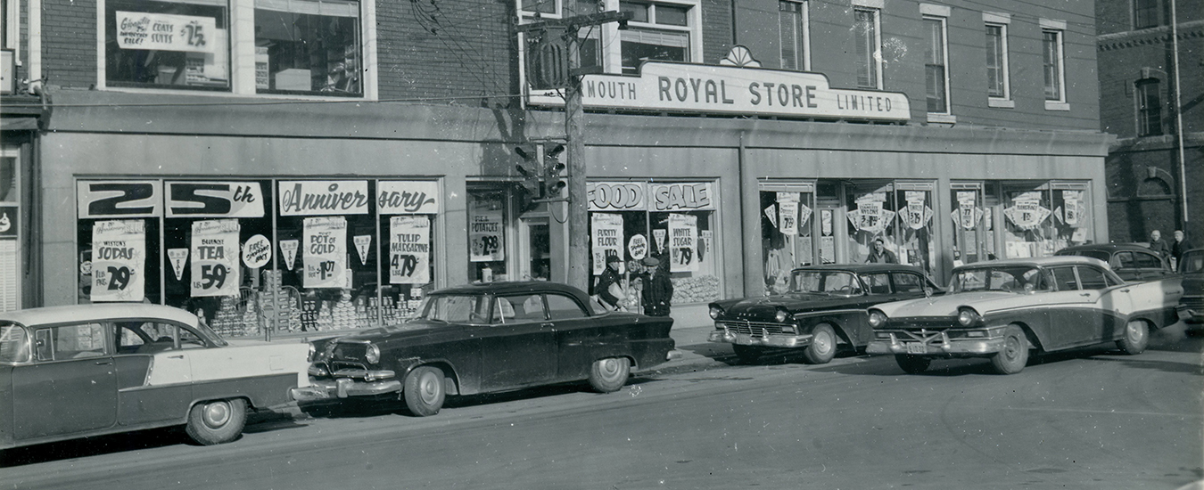 The circa 1856 “Baker and Young” building, the first, brick, mercantile building in southwest Nova Scotia, housed the Yarmouth Royal Store. “Cook and Stoneman” had been established there earlier by Michael Pickles Cook but in 1937, prominent businessmen Killam, Guest, Williamson, Kenney and O’Brien formed a partnership. They hired Wilmot Dean from Saint John, NB to be the first manager of the Yarmouth Royal Store: then proceeded with renovations “in a proper and workman-like manner.” Modest displays behind plate-glass windows and two main entrances invited customers into an atmosphere reminiscent of earlier times with an original hardwood floor, imposing staircase and heavy sales counters. Interior brick posts were replaced by steel beams to hold the weight of the second floor. Gradually, a sort of urban sprawl occurred so that buildings to the south became an appendage to the original Red Brick Building (as it was known) Blocks of buildings with names of Lyndsart and Victoria closed down, then resurfaced as departments of the Yarmouth Royal Store; men’s wear, shoes and a Marketeria. The full wall of the Gardner building was opened up for the grocery.