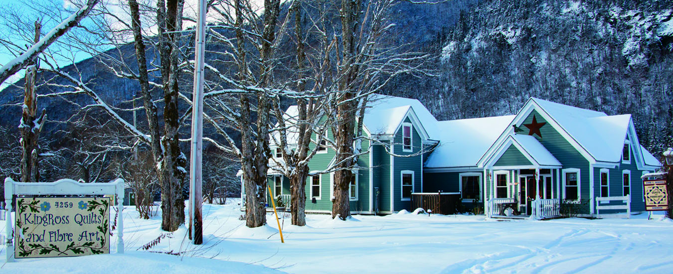 Careful or you’ll miss it. In a rail-fenced yard at the edge of a narrow, gravelled road, sits Kingross Quilts and Fibre Art—a modern quilt studio and gallery. Located in Nova Scotia’s Kingross community (also known as Big Intervale), surrounded by the Cape Breton Highlands and within earshot of the famous Margaree River, a simple sign by a roadside lamppost heralds this isolated edifice.