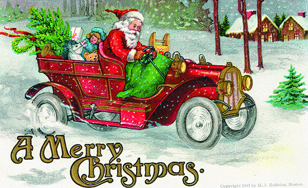 The most expensive item for any household to consider was a new automobile, which would have cost about the same as the most expensive phonograph. Many auto brands were on the market, and most dressed up their advertising with tried and true Christmas symbolism to point out how delighted the family would be to have a new car in the driveway to take them on seasonal excursions.