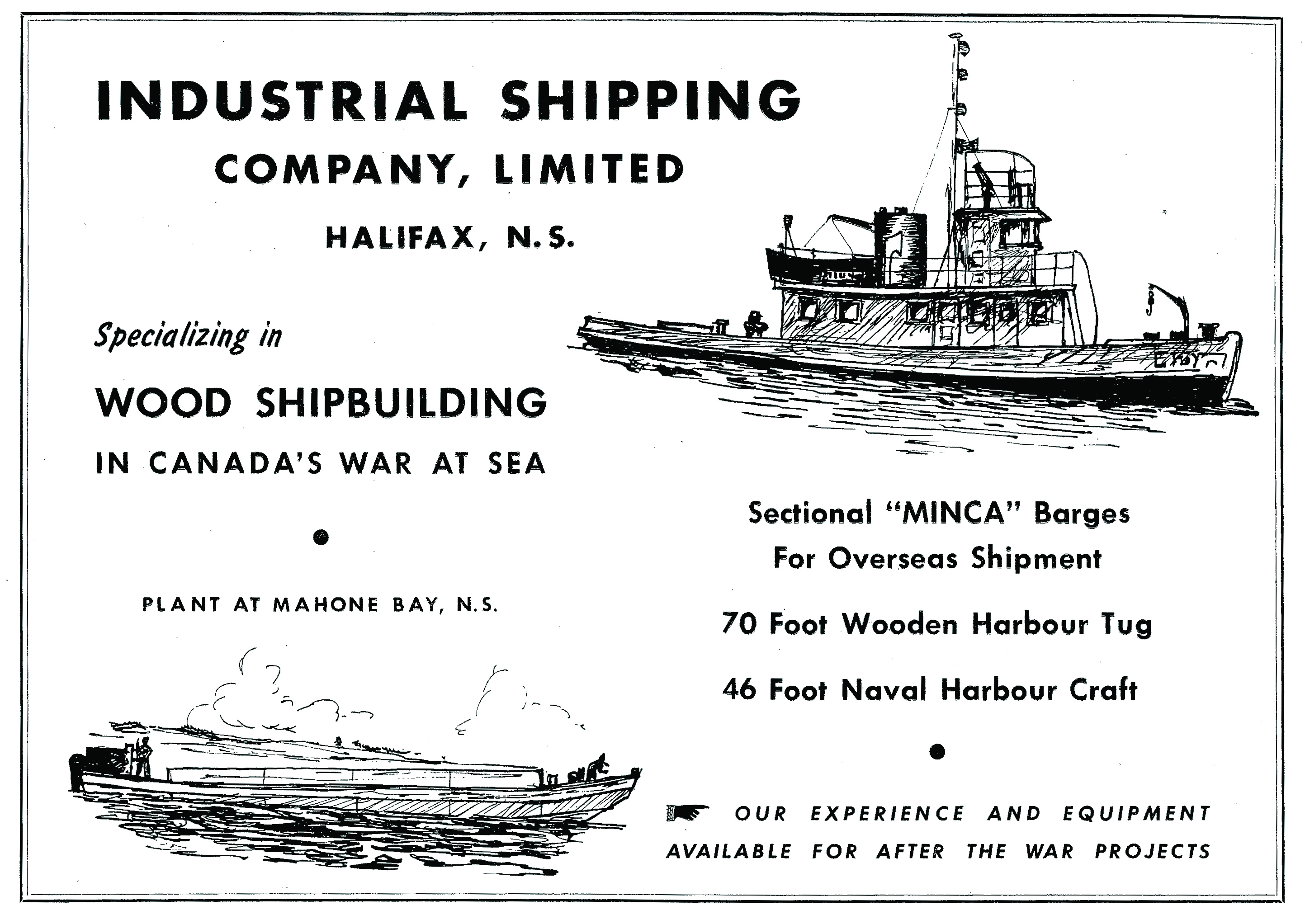 He singled out Industrial Shipping Co. Ltd. of Mahone Bay as perhaps providing the greatest service to Canada’s war effort, building the 70-foot TANAC wooden harbour tugs and 46-foot harbour naval craft for the navy in addition to the MINCA barges.