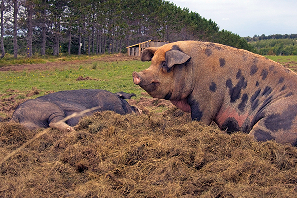 “We take really, really good care of them. They root, they dig, and they shovel outside. And you might think it’s better to keep them warm by locking them up in a stuffy barn in the winter, but animals kept outside are so much healthier than ones kept inside. These are heritage animals and their skin is almost three inches thick,” he continues. “They like the outside weather. In the winter, they choose to leave their shelter and spend most of the time outside rooting in the snow.”