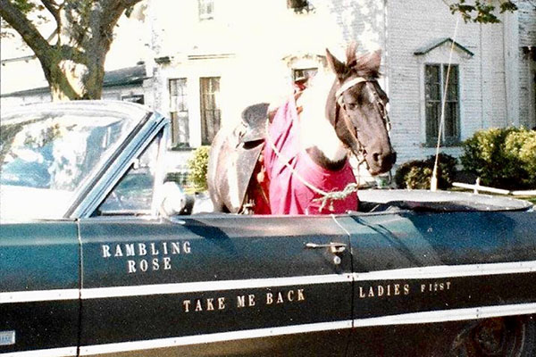 Leo’s claim to fame (aside from his irreverent attitude and love of chewing tobacco, despite being toothless) was trading three goats for a pony he named Rambling Rose. A photo from the 1970s shows the pony saddled, with a bridle and pink cape, riding in the back of Leo’s Plymouth Fury.