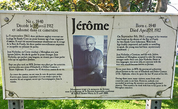 For seven years Jerôme lived in nearby Meteghan with a Corsican, John Nicholas, who spoke several languages and tried in vain to converse with the young man. Jerôme refused to speak yet seemed to understand French, English and Italian. After his legs healed, the ends were covered with leather caps, and Jerôme ambulated using his hands and leg stumps.