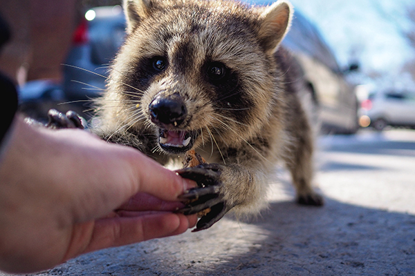 Back in Canada, one spring day I was called to rescue an adult raccoon, reported hit by a car on the highway near Antigonish, NS. Both its hind legs were broken. Outside the veterinary clinic she burst out of the box, scrambling into the wheel well behind a front tire. Oh dear. It took a bloody battle to extract her (my blood). After the vet put casts on her lower body and hind legs, I took her home. I had a wildlife rehabilitation permit at that time.