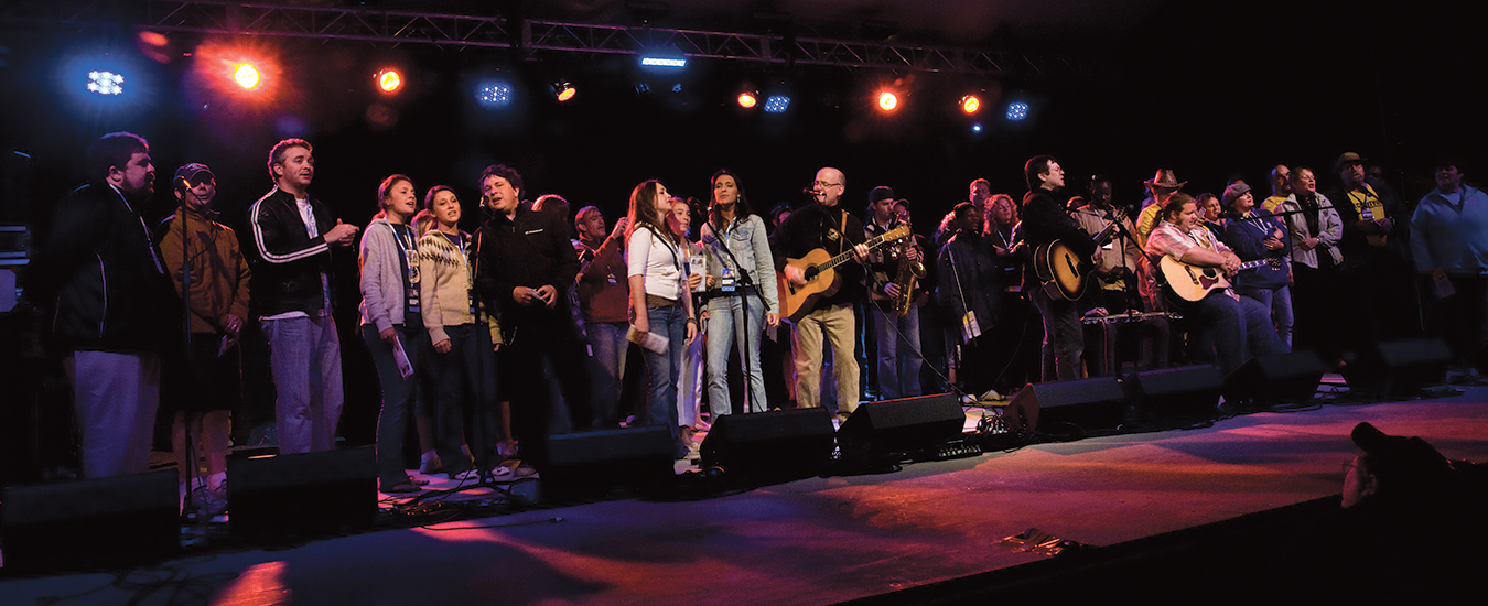 The sun is still shining as we head over to the main stage for the evening’s performances. Not fooled by the temporary spell of good weather (we experienced every adverse weather condition except snow in 2006), we bring warm sweaters in addition to our fold-up camp chairs, and select a good spot in the crowd to settle in for the night.