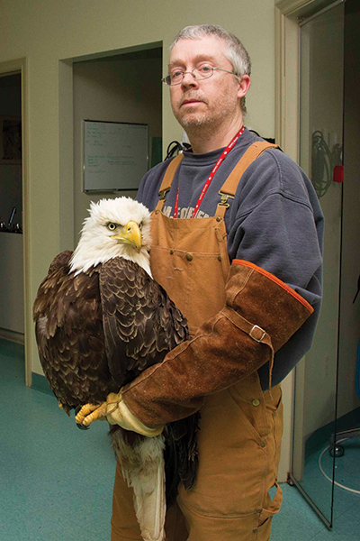 “The call we get is that an eagle is just sitting there; it won’t fly away or it’s flat as a pancake,” Van Doninck says. “It usually has droopy wings because it has no muscle strength. Their breathing is raspy because their throat muscles are paralyzed; they can’t swallow food. A lot of times, they are seizuring.”