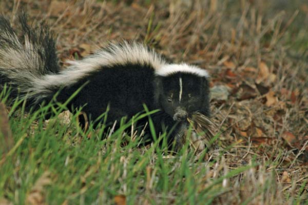 Stout, compact relatives of the weasel family, striped skunks come equipped with short legs and long claws on front paws for digging. They fare well in agricultural lands, but also dwell in forests and river valleys. They may leave the den at any hour of the day, but usually begin searching for food in late afternoon or early evening. During the night, they locate food by smell and hearing, and tend to wander over an area of about 10.4 acres.