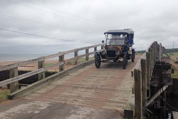 The tiny and unique bridge in Naufrage, PEI, (with antique vehicles out for a jaunt.)