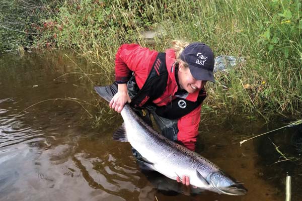 Kastine releases an Atlantic salmon “giant” on the Humber River in Newfoundland.