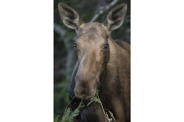 A female moose, known as a cow, feeds on browse on the outskirt of a bog.