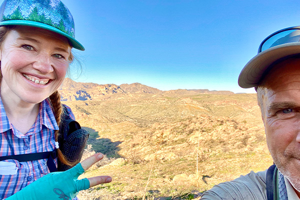 Séan hikes for his mental health, here shown in a selfie with Olympian Clara Hughes.