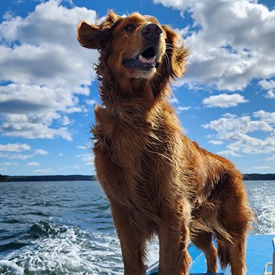 Land ho! Sam, an eight-year-old Golden Retriever is happiest on or in the water. When he is not navigating Nova Scotia’s Eastern Shore, he loves to relax with a liver treat in his oceanside cottage gazebo.