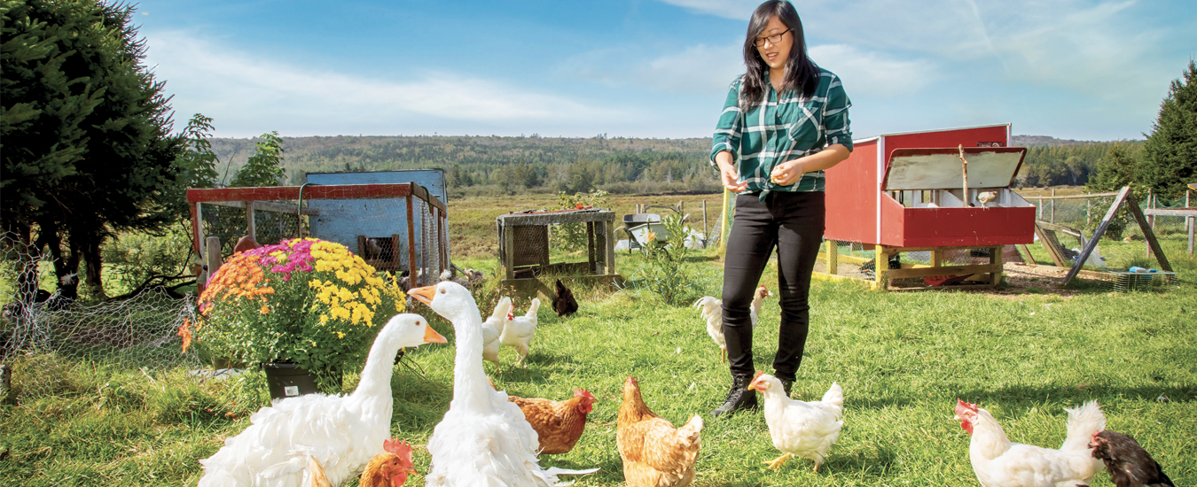 During the COVID-19 lockdowns, Jen decided that she and her partner had to move from Halifax, and consulted a realtor, who found them the property in Aspen. About a hectare of land stretches out toward the St. Mary’s River. The hilly range behind the house protects it from some of the elements. A thriving vegetable garden is carefully fenced off from feathery intruders, but during the day the birds roam the rest of the property at will, supplementing their feed with grubs and greens.
