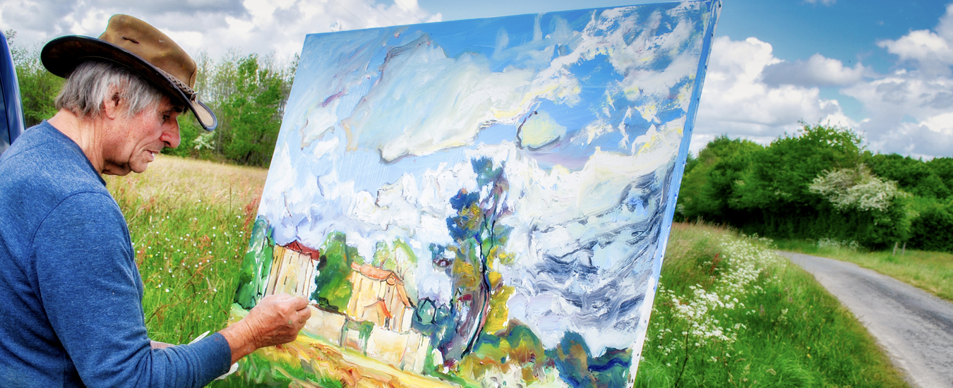 Galleries in Newfoundland, the Maritimes, France, and the southern U.S. represent his work. And there is a lot of work. Roy says painting is his drug, and he completes a painting almost every day, almost always en plein air, carrying his canvas and supplies to the edge of a village or a cliff and painting what he sees. Working quickly, each time with a unique palette of colours to suit the setting, Roy fills the canvas using tools he has on hand. When he taught art, he’d tell his students to use whatever cheap brushes they could afford.