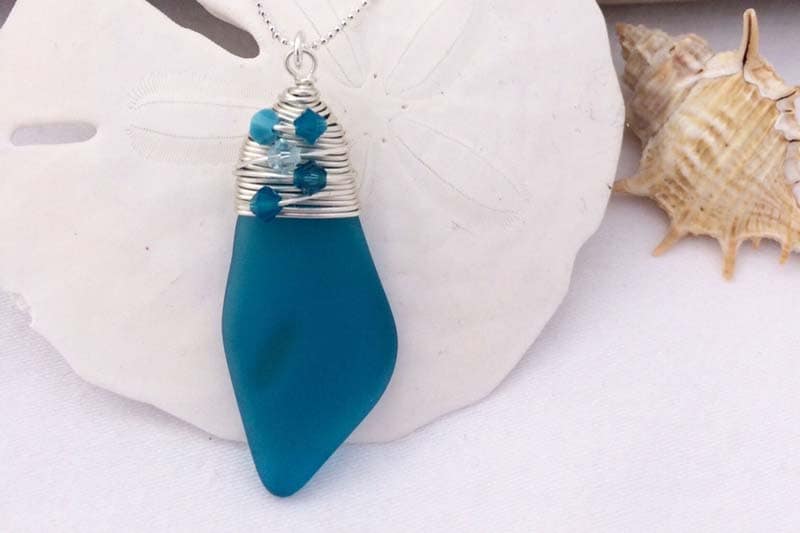 A large shard of cultured Aqua sea glass wrapped with Sterling silver wire and Swarovski crystals. To finish off this beautiful piece, it is hanging from a diamond cut 18" Sterling silver chain.