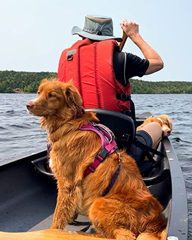 Gimli's first ride in a canoe, and he was sticking very close to his Mom. His big sister (one year older) is an old pro. She was keeping an eye out for other boats and ducks.