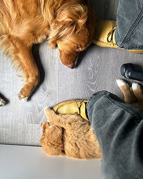 Working from home can offer some unique benefits, like two Tollers taking a nap under your desk!