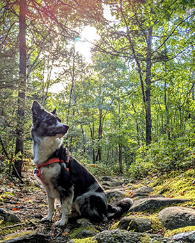 Mya the three-year-old Border Collie loves exploring new places and wearing her stylish bandanas. She’s always ready for her next adventure!